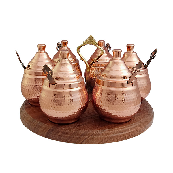 Wholesale buyers of copper vessels, if you’re seeking a copper spice rack set at an affordable price and of high quality, we recommend our 6-piece circular copper spice set. This product, due to its copper material and practicality, ranks among the bestsellers with excellent profit margins. Below, we will mention several features of the copper spice rack set: