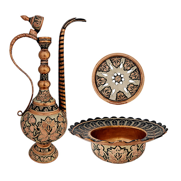 – The design of the copper pitcher and basin is uniquely from Abbasid flowers, silver-stroked with silver.