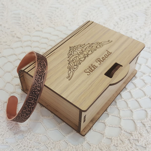 This beautiful copper bracelet with Islamic inscription is engraved Arabic phrase “من کنت مولاه فهذا علی مولاه” (Man Kuntu Mawlahu fa Hatha Aliyyun Mawlahu), meaning “Whoever I am his master, Ali is his master.” This powerful declaration, attributed to the Prophet Muhammad, holds deep spiritual and historical significance for Shi’a Muslims, especially as it relates to the celebration of Eid al-Ghadir.