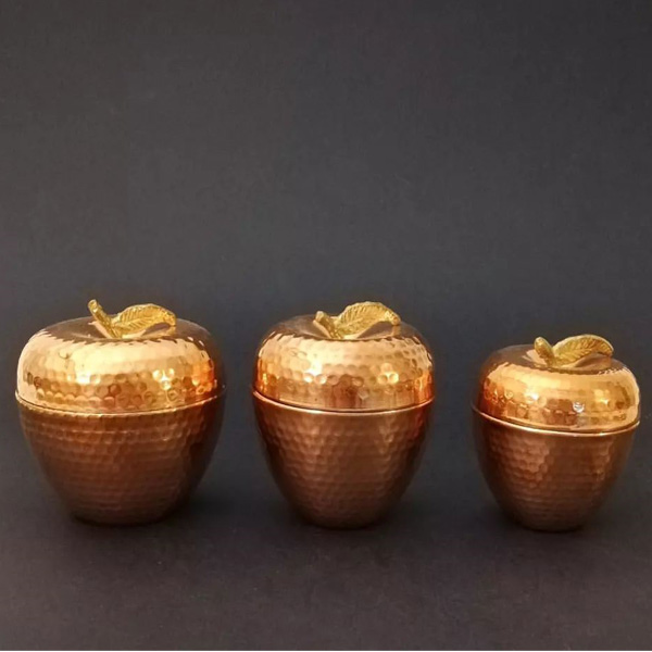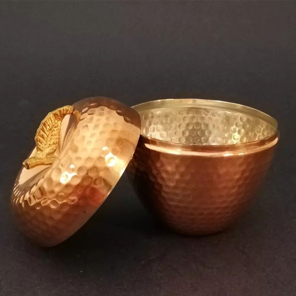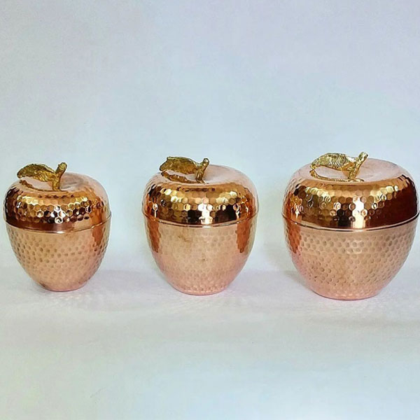 The Copper Sugar Bowl with Apple Design is a beautiful and eye-catching product from Saba Copper, highly sought after especially during the Persian New Year and for the Haft Seen table. It is one of the best-selling copper tableware, with significant demand. Purchase this product at the lowest wholesale price from Saba Copper. Click here to view other models of copper candy dishes.