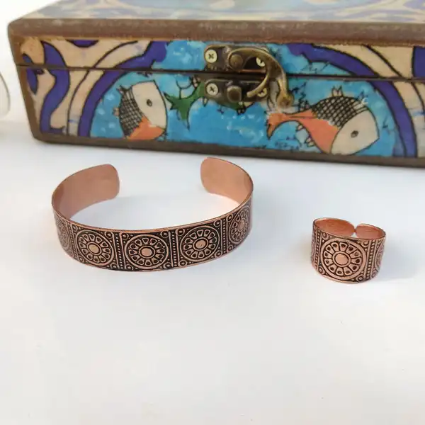 The Wide Lotus Copper Half-Set includes a bracelet and a ring made from pure copper.