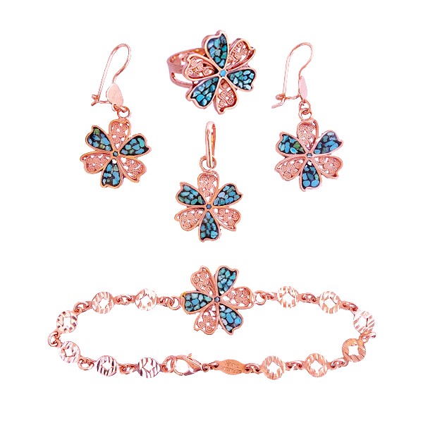 El Yapımı Fars Turkuaz ve Bakır Çiçekli Takı Seti – Turkuaz Kakmalı Filigran